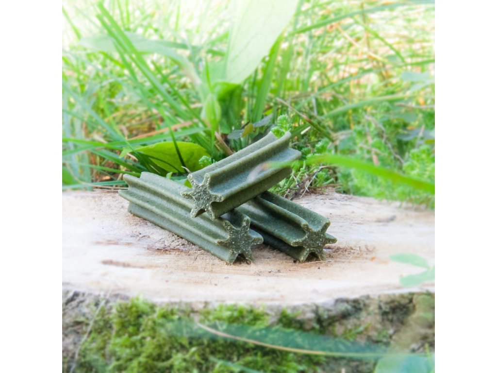 Dentální pochoutka DENTASTAR pro psy se neštěpí a lze rozkousat. Kousáním tohoto pamlsku pejsek přirozeně posiluje žvýkací svaly a čistí si zuby. Kousání uspokojuje přirozené potřeby psa. Dentastary jsou vhodné pro malé a středně velké psy. Tyčinky obsahují mátu peprnou a petržel a mají eukaliptovou příchuť.