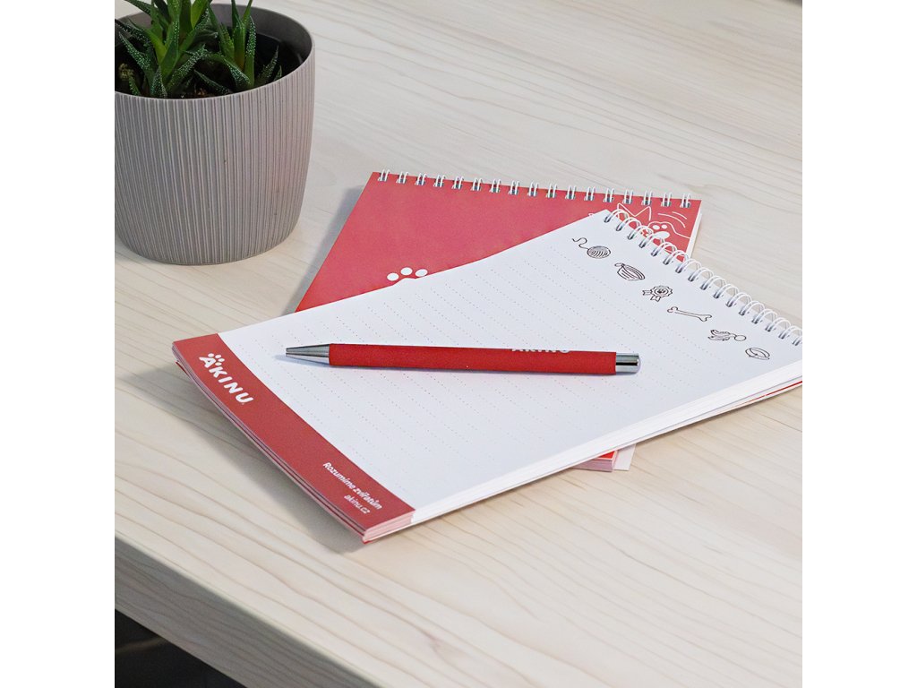 Elegantní červená kovová propiska s logem Akinu se stane vaším spolehlivým společníkem nejen do kanceláře, ale i na cesty. Psaní s ní je pohodlné, plynulé a díky kovovému tělu i odolné.