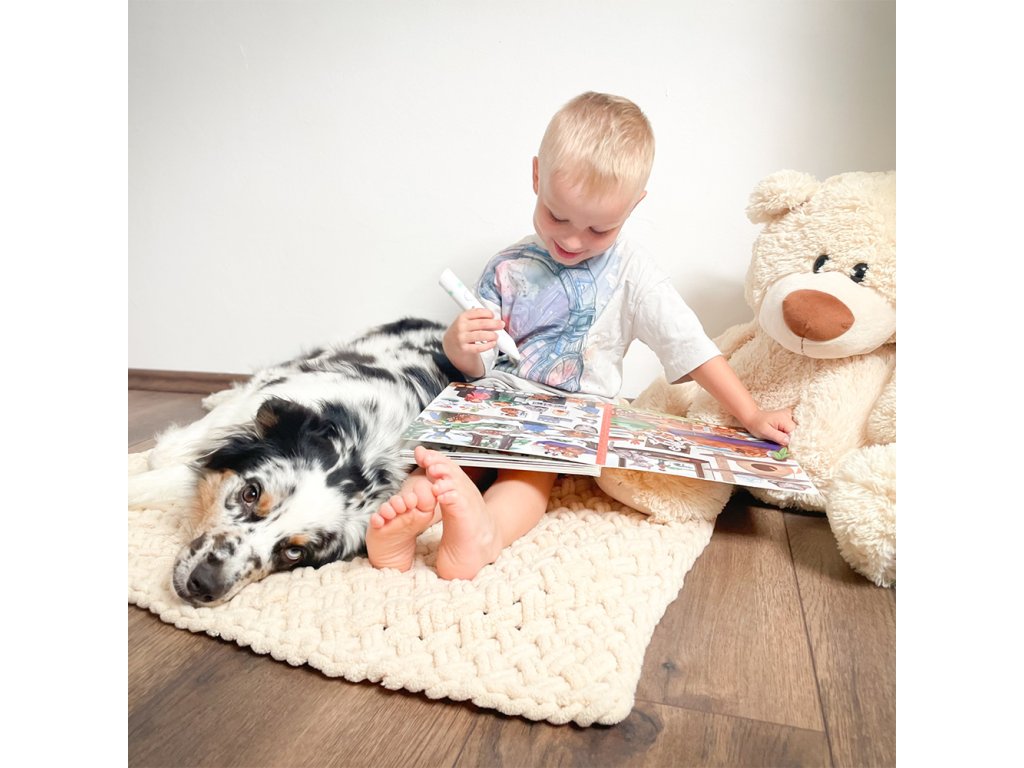 Kniha navíc obsahuje více než 2 200 zvukových stop, veselé písničky a dokonce i zábavnou deskovou hru. A protože jsme chtěli přinést ještě víc, natočili jsme i speciální výuková videa, která dětem pomohou s pochopením základních povelů pro trénink psa.