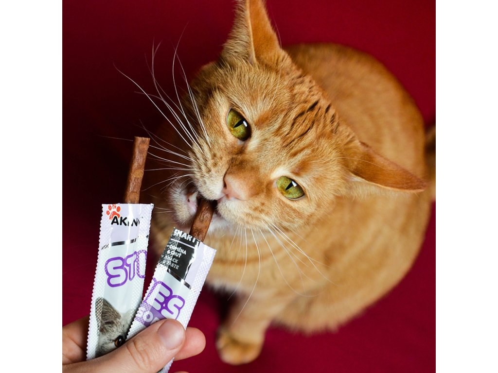 Míváte chuť na něco dobrého i chvilku poté, co jste snědli večeři a potřebujete si ještě něco zobnout? Kočky mívají podobné chutě a dávají to najevo nejčastěji tak, že se o vás nenápadně neustále otírají, podezřele dlouho se mazlí či vás dokonce prozíravě dovedou k místu, kde máte pamlsky schované.Akinu STICKIES tyčinky jsou lahodnou pochoutkou s chutí krůtího masa a jater. Obsahuje vitaminy a taurin pro lesklou srst. Zkuste obměnit křupavými nebo masovými variantami.