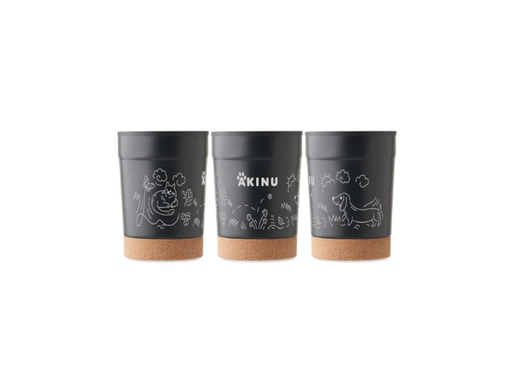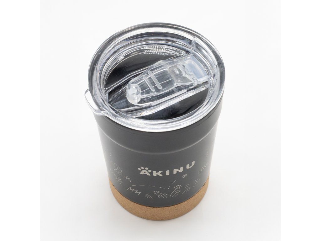 Černý termohrnek z nerezové oceli zdobí jemné gravírované kresby Akinu, které odkazují na lásku ke zvířatům. Spodní část hrnku tvoří korkové dno pro větší stabilitu a přírodní vzhled. Průhledné plastové víčko s těsnící gumou zabrání nechtěnému vylití nápoje. Díky kvalitnímu materiálu udrží váš nápoj teplý nebo studený po delší dobu.