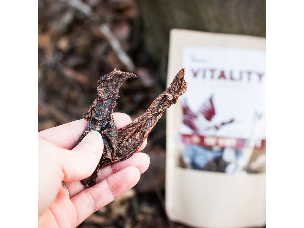 Extra pochoutka pro vašeho milovaného mazlíčka? I my pro něj chceme to nejlepší, proto přinášíme SUPERPRÉMIOVOU řadu VITALITY Jerky. Maso z divokých zvířat, nakrájené na plátky, usušené horkým vzduchem. 100 % masa = 100% spokojenost vašeho mazlíčka.Lokální maso z divoké kachny necestuje dlouhé měsíce po planetě a má v našich končinách zakořeněnou tradici. Kachní maso je výživné, lehce stravitelné a podporuje zdraví a vitalitu našich chlupáčů.