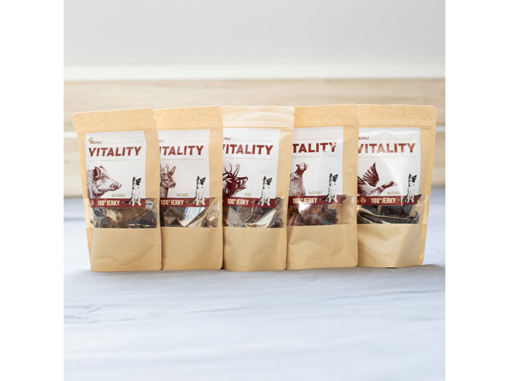Vyzkoušejte všech 5 druhů 50g VITALITY Jerky z našeho sortimentu.