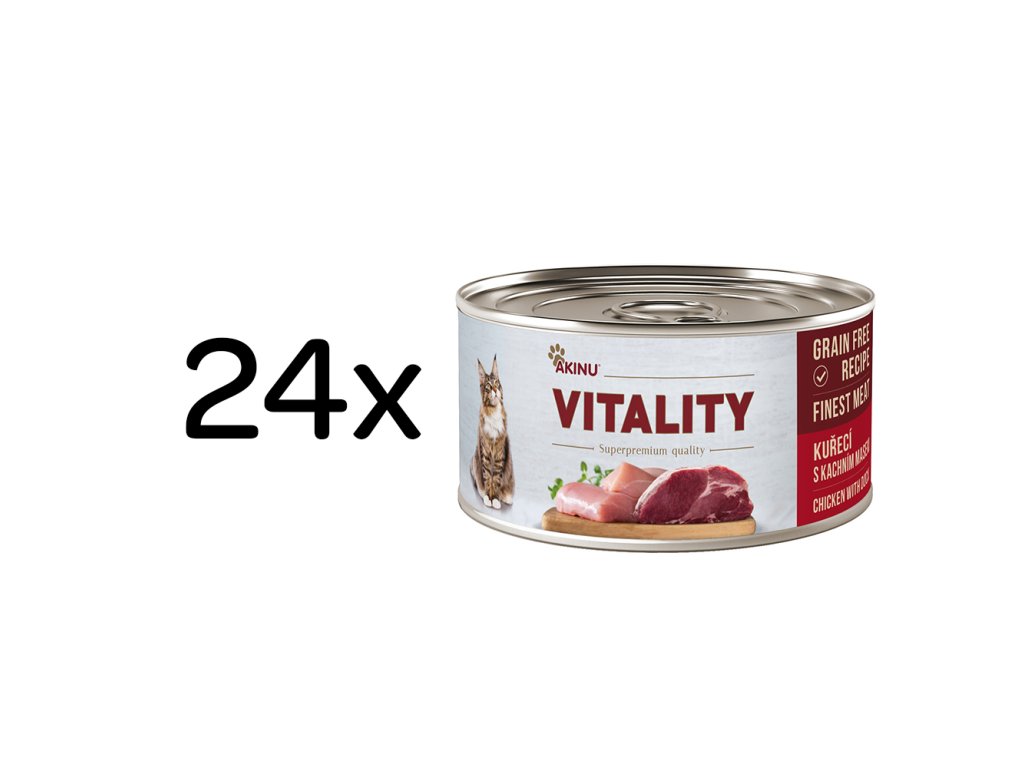 Hledáte pro svou kočičku kvalitní, zdravou a chutnou konzervu? Chcete jí dopřát jen to nejlepší a užívat si její spokojené vrnění? Kuřecí konzerva Akinu VITALITY s kachním masem neobsahuje konzervanty, barviva ani obilí a za to je plná vitamínů a pro vaši kočku prospěšných látek. A jak skvěle chutná!