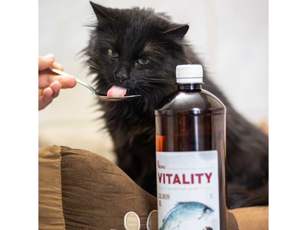 Akinu VITALITY LOSOSOVÝ OLEJ je extra čistý, za studena lisovaný a bezvodý. Netuhne v chladu (až do - 10 ⁰C) a neobsahuje příměsi jiných druhů olejů. Má vynikající účinek na kvalitu a lesk srsti a zlepšuje fungování metabolismu . Je přirozeným zdrojem energie a také jedinečným zdrojem nenasycených mastných kyselin Omega 3, DHA (kyselina dokosahexaenová) a EPA (kyselina eikosapentaenová). Je vhodný jako přísada a ochucovadlo pro zalití těstovin, nízkotučných granulí, libového masa či zeleniny.