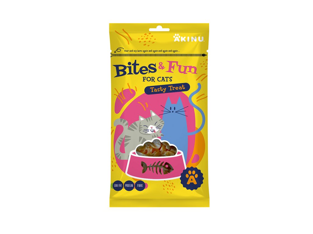 Pamlsky Akinu BITES & FUN jsou ideální pro kočky všech věkových kategorií a obsahují kuřecí maso s nízkým obsahem tuků, což přispívá ke zdravému stravování. Kuřecí kousky nejenže představují lahodnou pochoutku, ale také jsou skvělé pro trénink a podporu zubního zdraví vaší kočky. Díky technologii fresh zip zůstávají pamlsky dlouhodobě čerstvé, takže vaše kočka si může vychutnat každý kousek v maximální chuti a kvalitě.