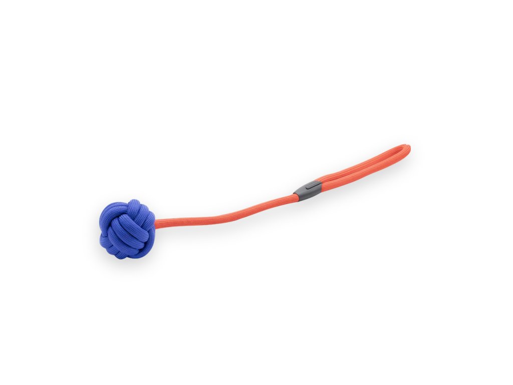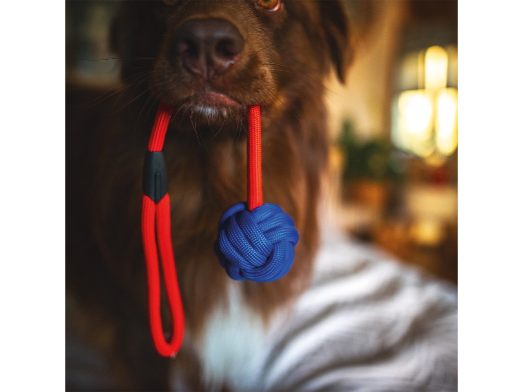 Lehká látková hračka dlouhá 45 cm spojuje míček a šňůrku v jedno, což umožňuje snadné házení i přetahování. Díky měkkému, ale odolnému materiálu je šetrná k psím zubům a dásním, ale zároveň dostatečně pevná na každodenní hru.