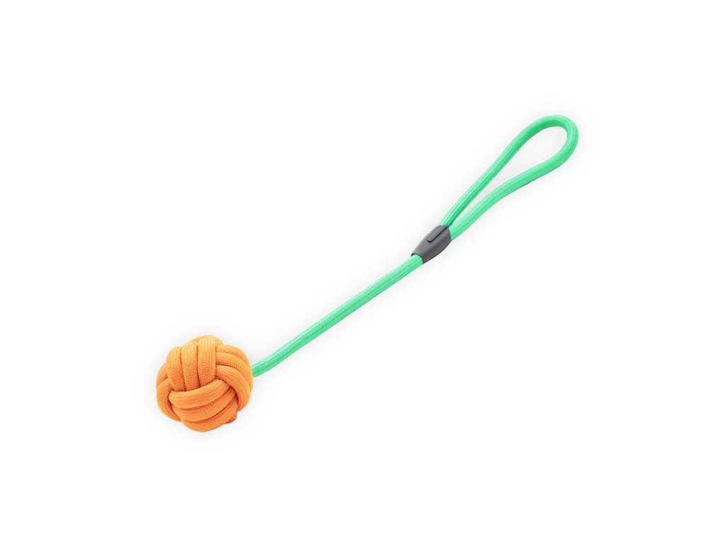 Lehká látková hračka dlouhá 45 cm spojuje míček a šňůrku v jedno, což umožňuje snadné házení i přetahování. Díky měkkému, ale odolnému materiálu je šetrná k psím zubům a dásním, ale zároveň dostatečně pevná na každodenní hru.