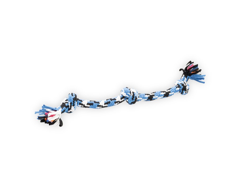 Toto bavlněné přetahovadlo o délce 45 cm je vyrobeno z odolného materiálu, který je šetrný k psím zubům. Díky třem pevným uzlům je vhodné i pro silnější čelisti a větší psy, kteří si rádi hrají na přetahovanou. Hračka zároveň podporuje zdravé žvýkání a pomáhá mechanicky čistit chrup.