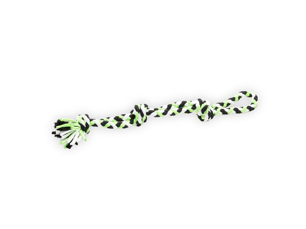 Tato odolná hračka je vyrobena z pevných bavlněných vláken spletených do tří uzlů, které podporují zdraví zubů a dásní. Díky praktickému držadlu je ideální pro přetahování i aportování.