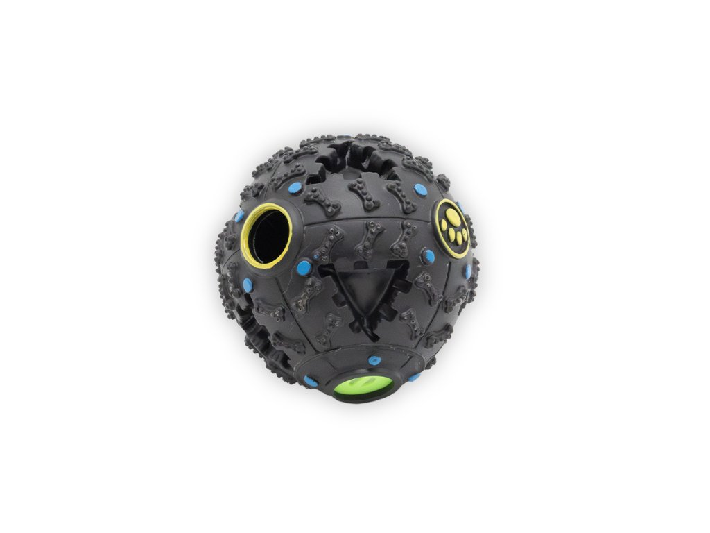 Tento pevný plastový míček o průměru 9,5 cm má otvor pro vkládání pamlsků a vydává specifický zvuk, který zaujme i ty nejvíc rozptýlené pejsky. Je ideální jako motivační pomůcka při tréninku nebo jako hračka na delší zabavení.