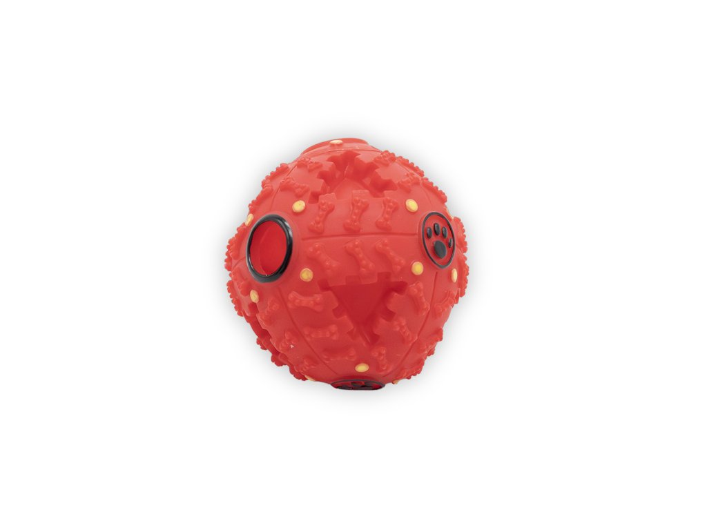 Tento pevný plastový míček o průměru 9,5 cm má otvor pro vkládání pamlsků a vydává specifický zvuk, který zaujme i ty nejvíc rozptýlené pejsky. Je ideální jako motivační pomůcka při tréninku nebo jako hračka na delší zabavení.