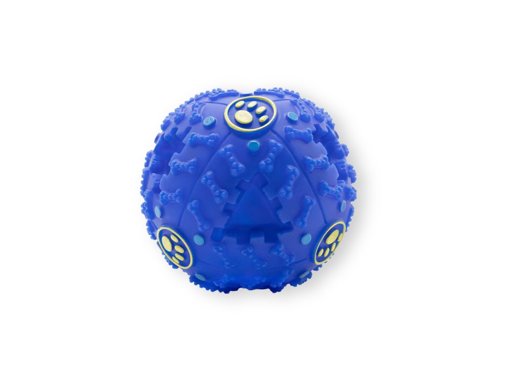 Tento pevný plastový míček o průměru 9,5 cm má otvor pro vkládání pamlsků a vydává specifický zvuk, který zaujme i ty nejvíc rozptýlené pejsky. Je ideální jako motivační pomůcka při tréninku nebo jako hračka na delší zabavení.